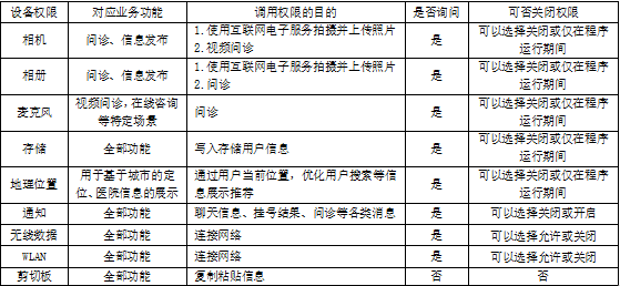 电话咨询、视频咨询可能会申请开启您的位置信息(地理位置)、相机/摄像头、麦克风(语音)、通讯录以及存储的相关权限,以便完成所需要的视频通话、拍摄、拍照、扫码等功能。