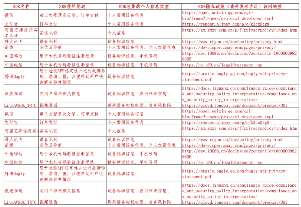 5、为了使您能够使用本政策项下的各项服务及功能,我们的应用中会嵌入合作伙伴的SDK或其他类似的应用程序,其中可能会涉及传输相关个人信息,具体如下: